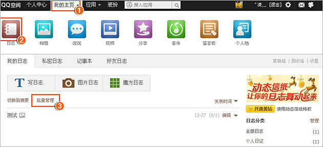 怎么样批量管理使用QQ空间日志的功能? 第一步:登录您的QQ空间,在导航条点击我的主页选择日志,进入日...